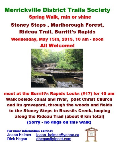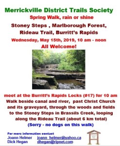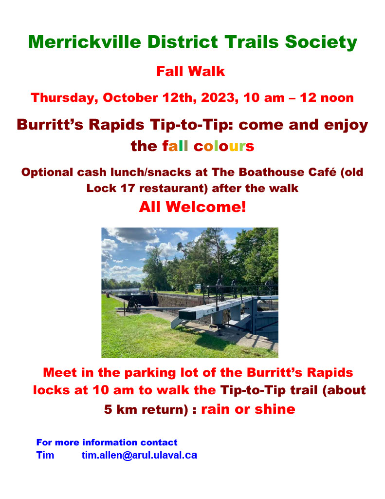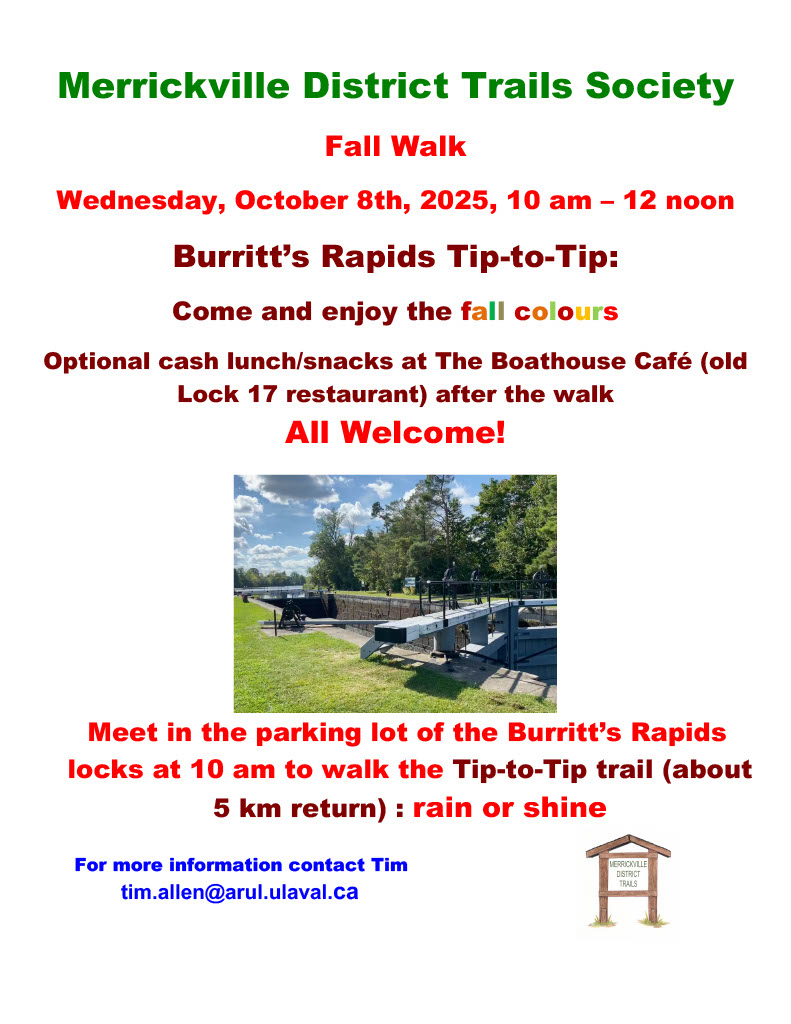 The 2015 Annual General Meeting of the Merrickville District Trails Society will be held on Saturday October 24th beginning at 9:30 am at the Merrickville Legion on Main Street. The business meeting will be followed by light refreshments and a presentation “Great Walks…not so far away” by local author, Carol Williams. Carol will highlight her recent adventures hiking the Bruce Trail, the Rideau Trail and Chemin des Outaouais (from Ottawa to Montreal). A lunch break will follow at 12:00 with an option to order and purchase lunch from Nana B’s bakery or bring your own lunch. Beginning at 1:00 pm and again at 2:00 pm concurrent group activities will include a one hour interpretive paddle up the Rideau in the Voyageur Canoe and a guided walk along the village Woodland Toboggan Hill Trail. The Voyageur Canoe paddle will travel up the Rideau into the Migratory Bird Sanctuary. Life jackets will be provided. There is no cost for either group outing but participants must sign up for the outings at the AGM and donations will be kindly accepted. All are welcome! For more information, please contact Denis at 613-269-2136 or Fred at 613-269-4306