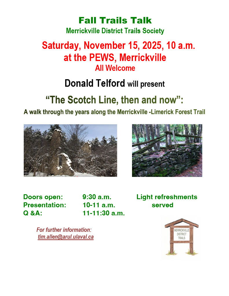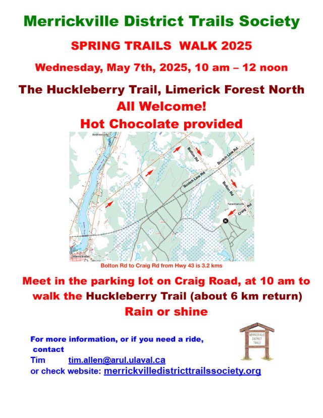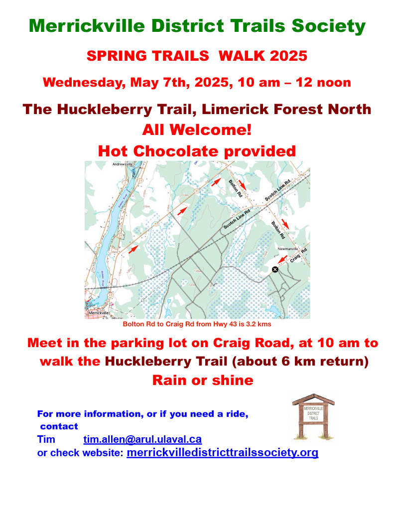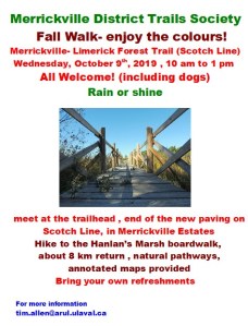 The Merrickville District Trails Society is pleased to invite you to its first post-Covid group activity, namely a walk on the Merrickville -Limerick trail, along the Scotch Line, through the forest to the Hanlan’s Marsh boardwalk, and return, on Wednesday, October 19th next, starting at 10 a.m. All are welcome. Meet at the trailhead on the Scotch Line at the edge of the Merrickville Estates. The walk is about 5 km each way, and will take a total of about 3-4 hours, so bring snacks or lunch. The path is natural and unimproved but is mostly even, so this is an easy walk, and we will walk in groups that can go at different paces. You can also turn around early and still have a wonderful walk. We will be walking rain or shine! See you soon, on the Trails.