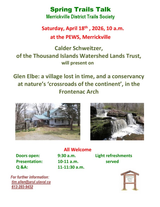 The 2014 Annual General Meeting of the Merrickville District Trails Society will be held on Saturday morning February 15th at the Merrickville United Church. The meeting will be followed by a presentation of the work completed on the Woodland – Toboggan Hill Loop and the planned Bird Sanctuary Trail. A one hour walk on one of our local trails, according to weather conditions, will complete the morning. All are welcome!